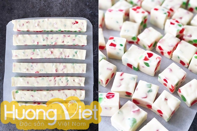 - Bước 4: Kẹo đông cứng thì lấy ra và cắt thành ô nhỏ vừa ăn.