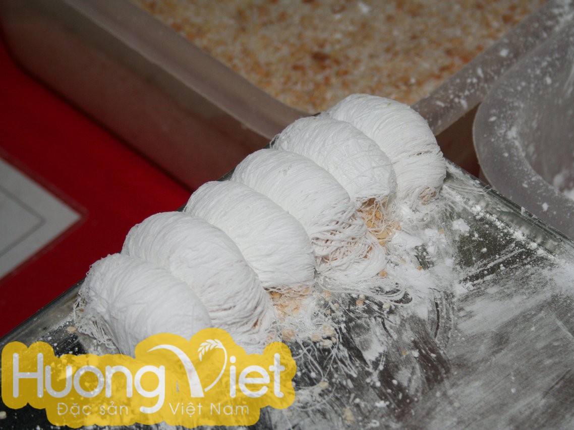 - Bước 4: Dùng tay kéo dãn khối bột 1 ra như sợi dây, rồi gấp lại làm đôi, rồi xoắn lại. Cho vào lò giữ ấm.