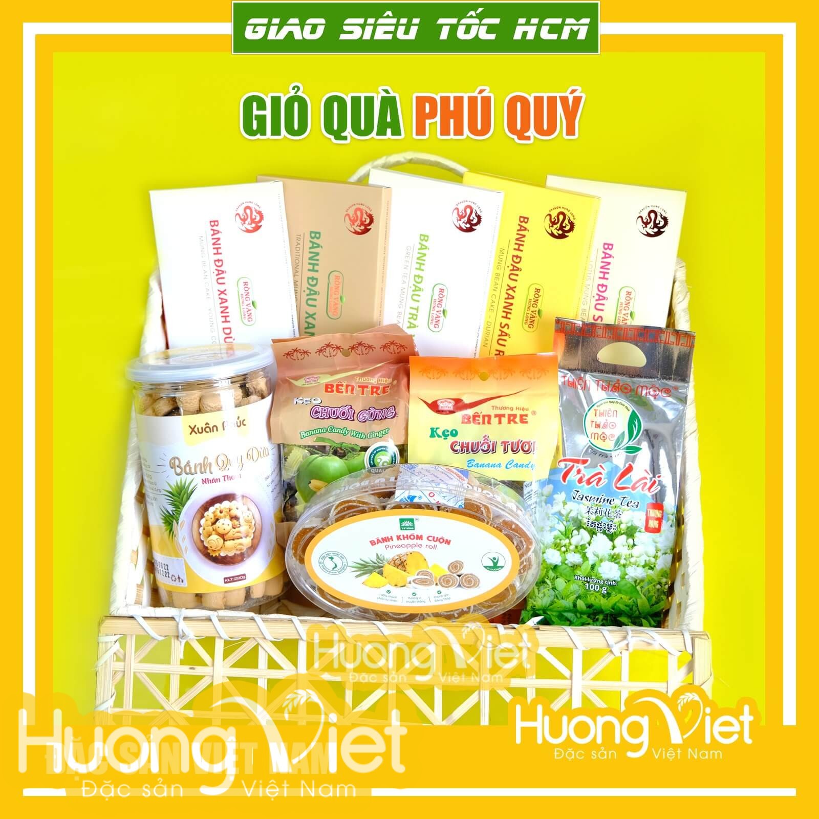 Một gợi ý tiếp theo khi không biết Trung thu mua gì chính là giỏ quà phú quý. Giỏ quà này đều là những sản phẩm đặc trưng của vùng miền kết hợp với giỏ đan tre đơn sơ, mộc mạc tạo ra điểm nhất khác biệt. Trong giỏ quà bao gồm nhiều sản phẩm như: bánh đậu xanh truyền thống/ dừa non/ trà xanh/ sầu riêng/ hạt sen, trà lai, bánh quy dừa đậu phộng, kẹo chuối tươi/ chuối gừng và mứt khóm cuộn phồng tôm.